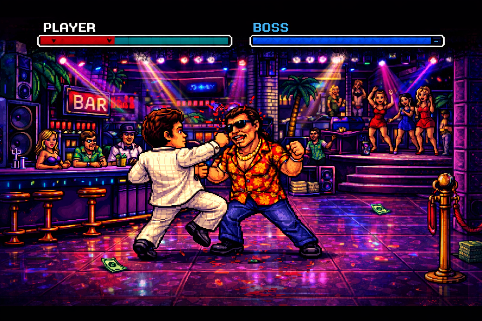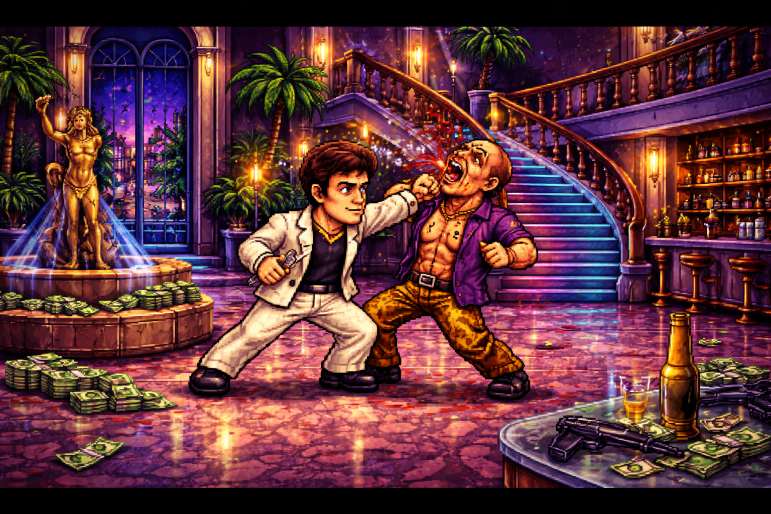 Set in the neon-soaked streets of 1980s Miami, Scarface – Tony’s Street Combat is a classic 2D side-scrolling arcade brawler inspired by retro console action games. You rise through the criminal underworld one fight at a time, carving your path from small-time hustler to undisputed king of the streets.